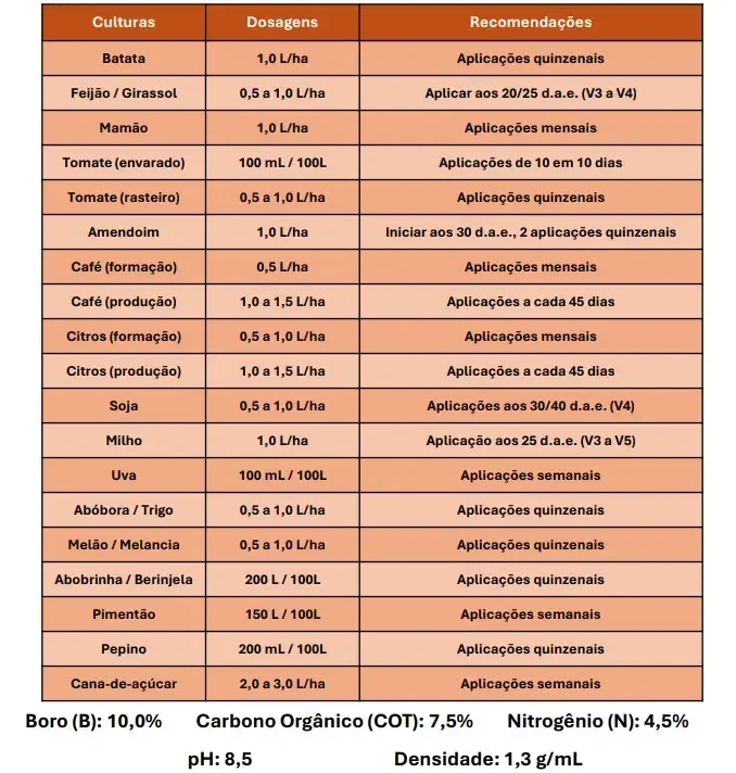 Formulado com Boro 10% e 20 aminoácidos livres derivados de colágeno de couro bovino, garantindo melhor absorção e aproveitamento metabólico. Possui ação quelatizante que favorece a disponibilidade dos nutrientes.